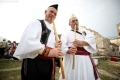The mayor of Gjirokastra, Flamur Golemi and singer of folk ensembles in traditional clothes in the Gjirokastra Castle before the start of the Folklore Festival of Gjirokastra. The festival will be held for 8 nights in the castle, on a stage open to all.