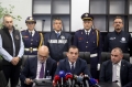 Italian police forces entering a SPAK press conference, where an anti-drug operation in cooperation with the Italian authorities was announced, from which 20 people have been arrested and 1 is wanted for drug trafficking.