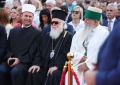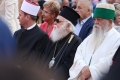 Grandfather Hajji Baba Mondi, orthodox Archbishop Anastasios Yannoulatos and head of the Muslim Community, Bujar Spahiu during the ceremony organized on Deshmoret e Kombit boulevard, in front of the Prime Minister's office on the occasion of Bill Clinton's first visit to Tirana. Clinton received the Star of Appreciation for Public Achievements award, while giving a speech about the achievements of the Albanian state and commented on the situation in northern Kosovo.