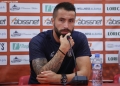 Captain of KF Tirana, Filip Najdovski during a press conference before the match with the Georgian team of Dinamo Batumi, valid for the first round of eliminations for the UEFA Conference League group stage.