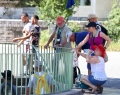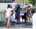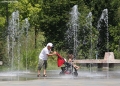 A man with a child in a stroller cool off in the fountains of Skenderbej Square, as a result of the high temperatures, July 18, 2023. Albania has been engulfed in a heatwave and drought that has scorched Europe, with temperatures well above 40 degrees Celsius.