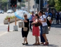 Citizens with hats on their heads, as a result of high temperatures, walking in the streets of Tirana on July 18, 2023. Albania has been engulfed in a heatwave and drought that has scorched Europe, with temperatures well above 40 degrees Celsius.