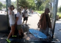 Tourists with hats and water bottles in the shade in Skanderbeg Square on July 18, 2023. Albania is affected by a wave of heat and drought that has hit all of Europe, with temperatures that have gone above 40 degrees Celsius.