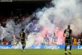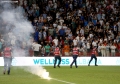 CLASH BETWEEN TIRANA AND BESIKTAS FANS - The fans of the Turkish team of Besiktas throw smokers onto the field, before the football match, Tirana - Besiktas (Besiktas), valid for the second round of eliminations for the UEFA group stage Conference League, played at Air Albania Stadium. The two fan groups collided before the start of the match, as they threw hard objects at each other, delaying the start by 14 minutes. They clashed even outside of the stadium and after the match.
