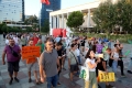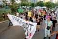 Members of the Joint Movement and citizens marching towards the Tiran municipality during a protest against the Tirana Mount project, whose works have begun behind the Palace of Culture. They have spoken against the destruction of the park.