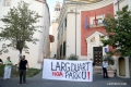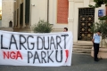 Members of the Bashke Movement hold a banner before the Tirana Municipality during a protest against the Tirana Mount project, whose works have begun behind the Palace of Culture. Members of the movement, as well as other citizens, have expressed their opposition to the destruction of the park.
