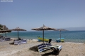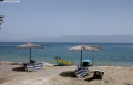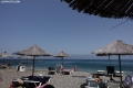 Boats and parasols on the shore of Lake Ohrid, near the village of Lin in Pogradec. Many tourists are directed to the coast and mountains of Albania to escape the new heat wave that has engulfed the country.