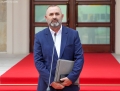 Justice Minister Ulsi Manja, speaks for the reporters in front of the Prime Minister's office, after a government meeting, regarding the approved decisions.