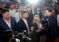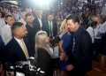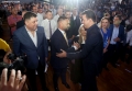 Chairman of the democratic party, Lulzim Basha greeting MPs Eralda Bano and Arbi Agalliu during the meeting of the National Assembly of DP, in the premises of the Sports Palace, Asllan Rusi. Members and MPs support Basha took part in the assembly. During the assembly, they voted for amendments in the party statute.