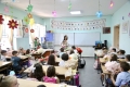 A teacher introducing herself to elementary school children, on the first day of the new school year, for elementary and middle school students, at Vasil Shanto school, in Tirana.