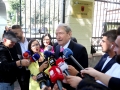 Former Prime Minister Sali Berisha speaking to journalists after coming out of the headquarters of the parliament, where a meeting was held with the opposition MPs. The members of the groups that support Sali Berisha and Gazment Bardhi took part. Lulzim Basha and the Mps who support him boycotted the meeting.