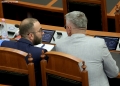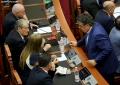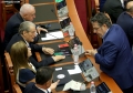 MPs Gazment Bardhi and Agron Gjekmarkaj speaking during a parliamentary session, in which the draft for private pensions was discussed and approved. During the session, Prime Minister Edi Rama was absent.