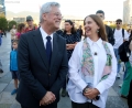 Minister of Tourism and Environment, Mirela Kumbaro and the ambassador of Germany in Tirana, Karl Bergner during an activity in front of the national historical museum, where its mosaic has been re-conceptualized as an image showing the Albanian flora and fauna. The activity marks the launch of the campaign Albania is biodiversity, which aims at discussions and reflections on the nature of Albania.