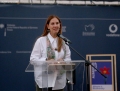 The Minister of Tourism and Environment, Mirela Kumbaro speaking during an activity in front of the national historical museum, where its mosaic has been re-conceptualized as an image showing the Albanian flora and fauna. The activity marks the launch of the campaign Albania is biodiversity, which aims at discussions and reflections on the nature of Albania.