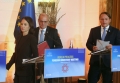 The Minister for Europe and Foreign Affairs, Igli Hasani, the Minister of Foreign Affairs of the Federal Republic of Germany, Annalena Baerbock and the European Commissioner for Neighborhood and Enlargement, Oliver Varhelyi speaking during a joint press conference after a meeting of the Foreign Ministers of the EU and those of the Western Balkans in Tirana, in the framework of the Berlin Process. This meeting precedes the Berlin Process Summit that will be held in Tirana on October 16, 2023. The second session of the meeting and the family photo was boycotted by Serbian Foreign Minister Ivica Dacic after debates with German Minister Baerbock regarding the events in Kosovo.
