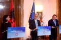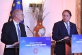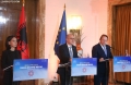 The Minister for Europe and Foreign Affairs, Igli Hasani and the European Commissioner for Neighborhood and Enlargement, Oliver Varhelyi speaking during a joint press conference after a meeting of the Foreign Ministers of the EU and those of the Western Balkans in Tirana, in the framework of the Berlin Process. This meeting precedes the Berlin Process Summit that will be held in Tirana on October 16, 2023. The second session of the meeting and the family photo was boycotted by Serbian Foreign Minister Ivica Dacic after debates with German Minister Baerbock regarding the events in Kosovo.