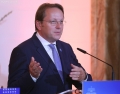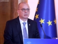European Commissioner for Neighborhood and Enlargement, Oliver Varhelyi speaking during a joint press conference after a meeting of the Foreign Ministers of the EU and those of the Western Balkans in Tirana, in the framework of the Berlin Process. This meeting precedes the Berlin Process Summit that will be held in Tirana on October 16, 2023. The second session of the meeting and the family photo was boycotted by Serbian Foreign Minister Ivica Dacic after debates with German Minister Baerbock regarding the events in Kosovo.