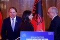 The Minister for Europe and Foreign Affairs, Igli Hasani, the Minister of Foreign Affairs of the Federal Republic of Germany, Annalena Baerbock and the European Commissioner for Neighborhood and Enlargement, Oliver Varhelyi after a joint press conference after a meeting of the Foreign Ministers of the EU and those of the Western Balkans in Tirana, in the framework of the Berlin Process. This meeting precedes the Berlin Process Summit that will be held in Tirana on October 16, 2023. The second session of the meeting and the family photo was boycotted by Serbian Foreign Minister Ivica Dacic after debates with German Minister Baerbock regarding the events in Kosovo.