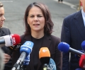 MINISTERS SPEAK TO THE JOURNALISTS - The Minister of Foreign Affairs of the Federal Republic of Germany, Annalena Baerbock speaking to the journalists after a meeting of the Foreign Ministers of the EU and those of the Western Balkans in Tirana, in the framework of the Berlin Process. This meeting precedes the Berlin Process Summit that will be held in Tirana on October 16, 2023. The second session of the meeting and the family photo was boycotted by Serbian Foreign Minister Ivica Dacic after debates with German Minister Baerbock regarding the events in Kosovo.