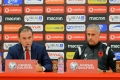 The coach of the Albanian national football team, Sylvinho and the player Thomas Strakosha speaking at a press conference before the friendly match with Bulgaria.