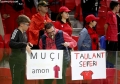 Fans hold signs during the friendly football match, Albania vs Bulgaria, 2-0, played at the Air Albania stadium in Tirana.