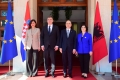 The President of the Republic, Bajram Begaj and his wife, Amarda, and the Croatian President, Zoran Milanovic and his wife, Sanja Music Milanovic, during an official reception ceremony at the Presidency. During a press conference after the reception, Milanovic spoke about the issue of Kosovo and Albania's path towards the EU.