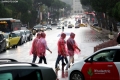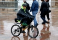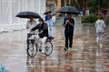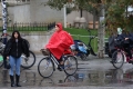 Citizens with umbrellas on bicycles on a rainy day, while the roads are flooded by heavy rains in Tirana, creating heavy traffic. Albania has been affected by the storm Ciaran which has hit Europe and in Italy it has caused several victims and great material damage. As a result of the heavy rains, traffic has been blocked on some road axes, while water has entered some homes and businesses.