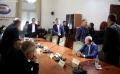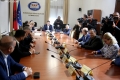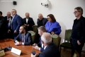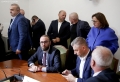 MPs leaving a session of the parliamentary committee on national security, where Member of Parliament Flamur Noka is sitting in the seat of the chairman, in this case, Nasip Naco. The latter interrupted the physical session and announced that it would take place online. After the tensions in the parliament, the opposition MPs have tried to hinder sessions of the various parliamentary committees.