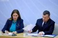 Minister of the Interior, Taulant Balla and Minister of Tourism and Environment, Mirela Kumbaro speaking during a press conference where they announced the signing of the agreement for the noise limit level for a given environment in the field of economic and social activities.