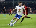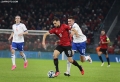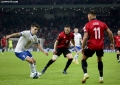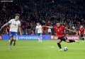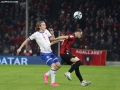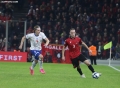 Myrto Uzuni of Albania in a duel with Brandur Olsen of the Faroe Islands during the football match, Albania vs Faroe Islands, 0-0, played at the Air Albania stadium in Tirana. At the end of the game, Albania qualified first in the group with 15 points.