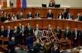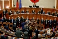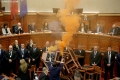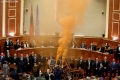 Parliament hall filled with smoke during a parliamentary session where opposition MPs lit smokers, while they gathered the other chairs around the lectern. During the session, the MPs and ministers of the majority have approved the draft budget for the year 2024.