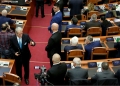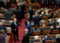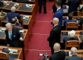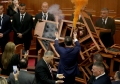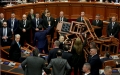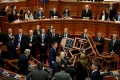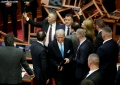 Former Prime Minister Sali Berisha leaving the group of MPs during a parliamentary session where opposition MPs lit smokers and set fire to some chairs, while they gathered other chairs around the pulpit. During the session, the deputies and ministers of the majority have approved the draft budget for the year 2024.