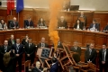 Prime Minister Edi Rama and Ministers Belinda Balluku and Elisa Spiropali at a time while MP Flamur Noka holds smokers in his hands during a parliamentary session where opposition MPs lit smokers and set fire to some chairs, while they gathered other chairs around the pulpit. During the session, the MPs and ministers of the majority have approved the draft budget for the year 2024.