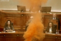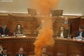 Prime Minister Edi Rama and Ministers Belinda Balluku and Elisa Spiropali at a time while MP Flamur Noka holds smokers in his hands during a parliamentary session where opposition MPs lit smokers, while they gathered other chairs around the pulpit. During the session, the MPs and ministers of the majority have approved the draft budget for the year 2024.