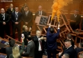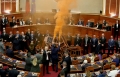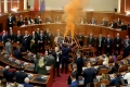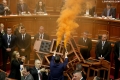 MP Flamur Noka holds smokers in hands during a parliamentary session where the opposition MPs lit smokers and set some chairs on fire, while they gathered the other chairs around the lectern. During the session, the deputies and ministers of the majority have approved the draft budget for the year 2024.