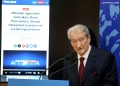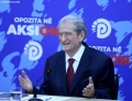 Former Prime Minister Sali Berisha entering a press conference in the headquarters of the democratic party. He commented on the change in the security measure for Jamarber Malltez under house arrest while attacking Prime Minister Rama for controlling the justice system.