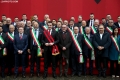 VELIAJ HOSTS THE MAYORS OF THE REGIONAL MUNICIPALITIES - The Mayor of Tirana, Erion Veliaj and representatives of the Albanian municipalities, members of the Union of Albanian Municipalities in the Region, posing with the Albanian flag placed on the facade of the Tirana municipality, before the celebrations on the occasion of the 28 November, the 111th anniversary of the declaration of Independence.