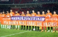 The players of Tirana and Partizan open a banner against violence against women before the derby football match, Partizani vs Tirana, 1-1, valid for the Albanian Super League, played at the Air Albania stadium in Tirana.