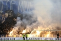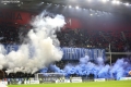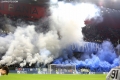 Tirana fans open a banner and light flares during the football derby match, Partizani vs Tirana, 1-1, valid for the Albanian Super League, played at the Air Albania stadium in Tirana.