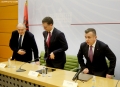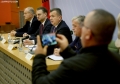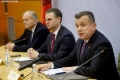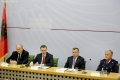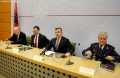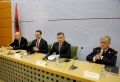 The Minister of the Interior, Taulant Balla, the Minister of Finance and Economy, Ervin Mete and the Director General of the State Police, Muhamet Rrumbullaku speaking during a press conference where the first employees of the State Police who meet the criteria to get zero interest loans for housing were announced. The government program foresees that by 2025, there will be at least 900 beneficiary families of police officers in need of housing.