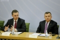The Minister of the Interior, Taulant Balla and the Minister of Finance and Economy, Ervin Mete during a press conference where the first employees of the State Police who meet the criteria to get zero interest loans for housing were announced. The government program foresees that by 2025, there will be at least 900 beneficiary families of police officers in need of housing.