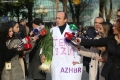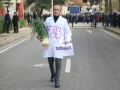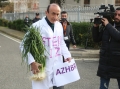 DASHAMIR SULA IN FRONT OF THE PARLIAMENT - MP Dashnor Sula, wearing a doctor's apron, which says sterilization, and a bunch of leeks in his hands, entering the parliament building before a parliamentary session.