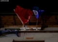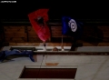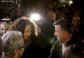Former Prime Minister Sali Berisha waves the flag of DP and Albania from the balcony of his apartment on Mustafa Matohiti Street. Argita Berisha and Berisha's supporters gathered below the apartment in support of the former prime minister after the decision on house arrest for him.