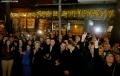 Former Prime Minister Sali Berisha waves a democratic party flag from the balcony of his apartment on Mustafa Matohiti Street. Argita Berisha and Berisha's supporters gathered below the apartment in support of the former prime minister after the decision on house arrest for him.