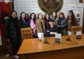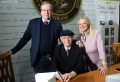Writer Fatos Kongoli posing with high school students of Tirana posing during a ceremony organized by the Academy of Sciences, organized on the occasion of Kongoli's 80th anniversary. Fatos Kongoli is one of the representatives of modern Albanian literature.