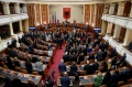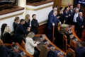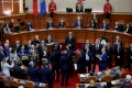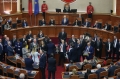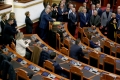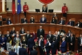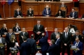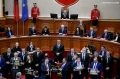 Opposition MPs blocking the floor and shouting in a moment of tension during a parliamentary session. The session marks the session of the Sixth and Tenth Legislature of the Assembly of Albania, while the appointments of Blendi Gonxhe as Minister of Economy, Culture and Innovation and Adea Pirdeni as Minister of State for Administration and Anti-Corruption were approved.
