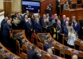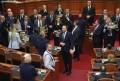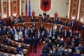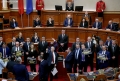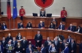 MP Ervin Salianji and opposition MPs blocking the floor in a moment of tension during a parliamentary session. The session marks the session of the Sixth and Tenth Legislature of the Assembly of Albania, while the appointments of Blendi Gonxhe as Minister of Economy, Culture and Innovation and Adea Pirdeni as Minister of State for Administration and Anti-Corruption were approved.