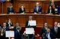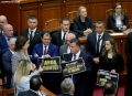 Opposition MPs blocking the floor in a moment of tension during a parliamentary session. The session marks the session of the Sixth and Tenth Legislature of the Assembly of Albania, while the appointments of Blendi Gonxhe as Minister of Economy, Culture and Innovation and Adea Pirdeni as Minister of State for Administration and Anti-Corruption were approved.