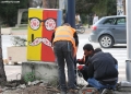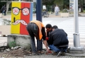 Worker fixing internet lines, near a traffic light in the center of Tirana. People are enjoying the high temperatures on this winter day sitting outside the bars and walking in the streets of the city.