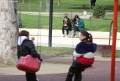 Two girls watch their mobile phones at the Taiwan park in the center of Tirana. People are enjoying the high temperatures on this winter day sitting outside the bars and walking in the streets of the city.